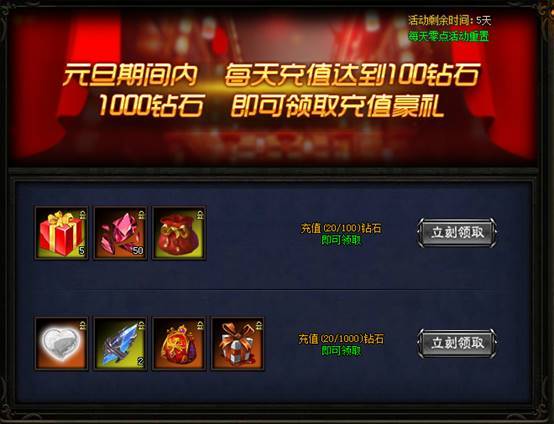 活动内容:每充值500钻石即可领取元旦回馈好礼