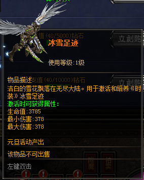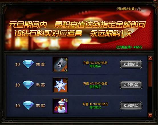累积充值5000钻石:10钻石购买绝版冰雪足迹*1(元旦订制)