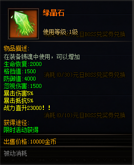 绿晶石*1(暴击伤害5%,暴击抵抗5%)(永久限量兑换1个):消耗70张元旦BOSS兑奖卷