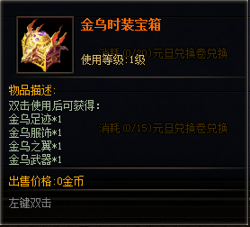 金乌时装宝箱(全套时装炫酷外形+4W5战力直升)*1:消耗90个元旦兑换卷