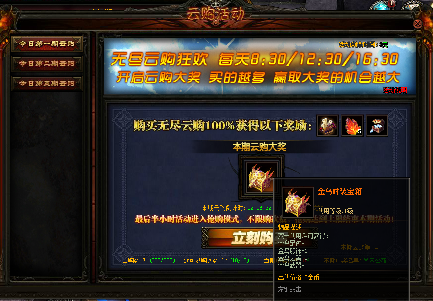 1.每期每轮全服抢购次数有限,抢购完毕后即刻开奖,若本期云购活动时间剩余时间大于半小时,即额外开启一场同样的云购