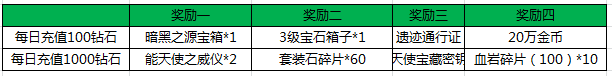 累计消费2000钻石(重复领取5次):套装石碎片*200 暗黑之源宝箱*5